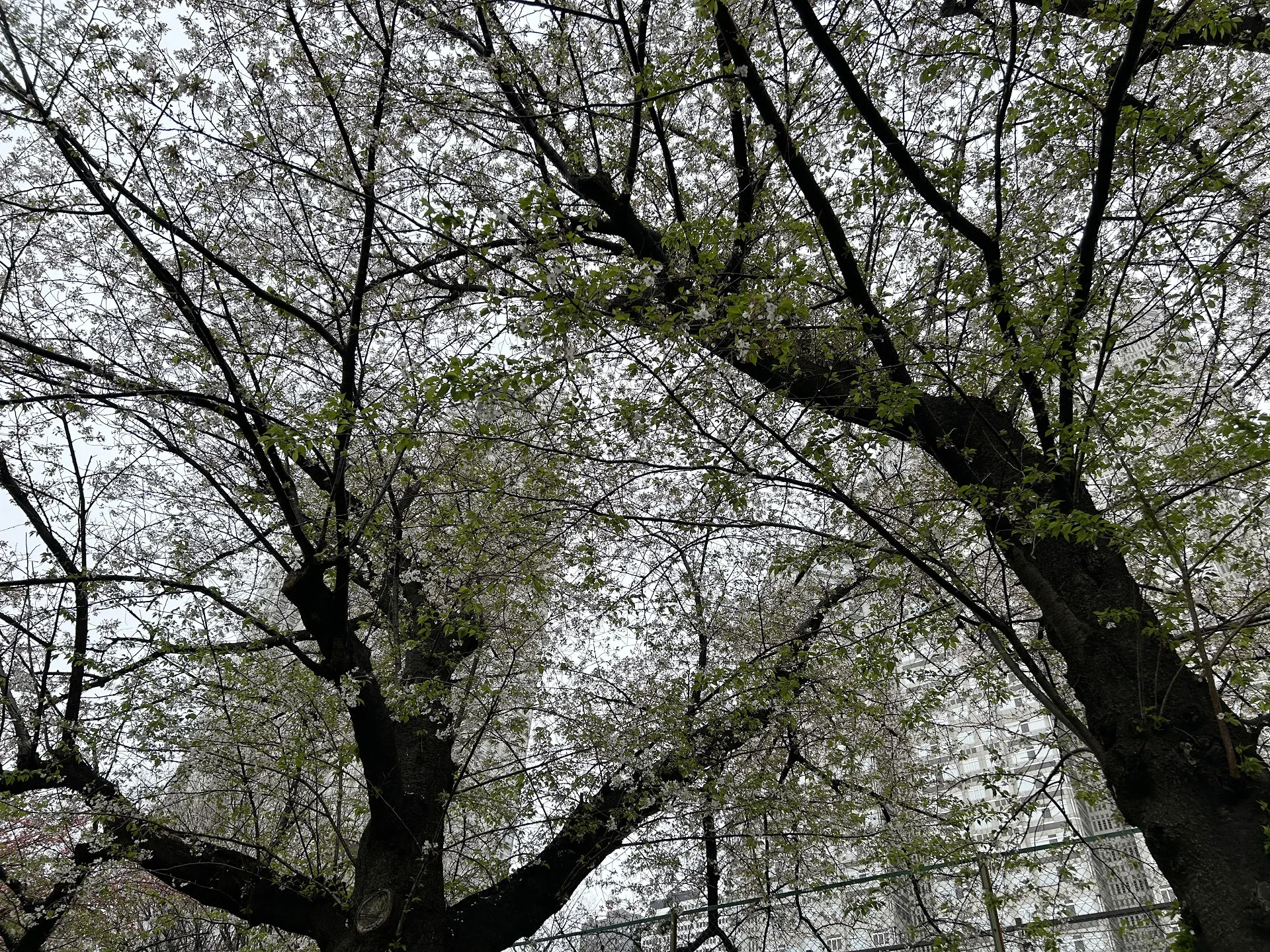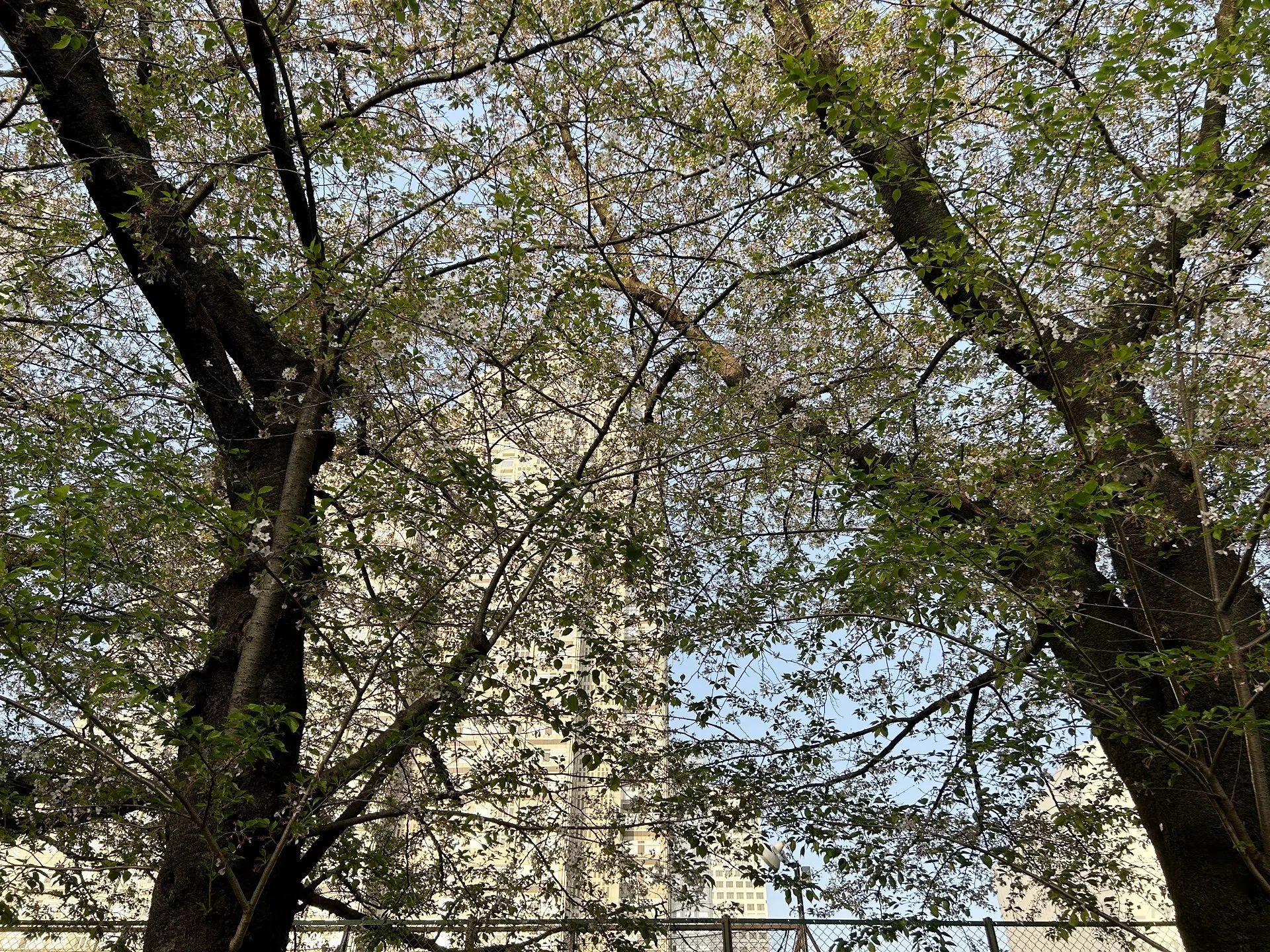 歩道にはほとんど花びらが見られません、木には根気よく残った花びらがわずかに見られる程度となっています。